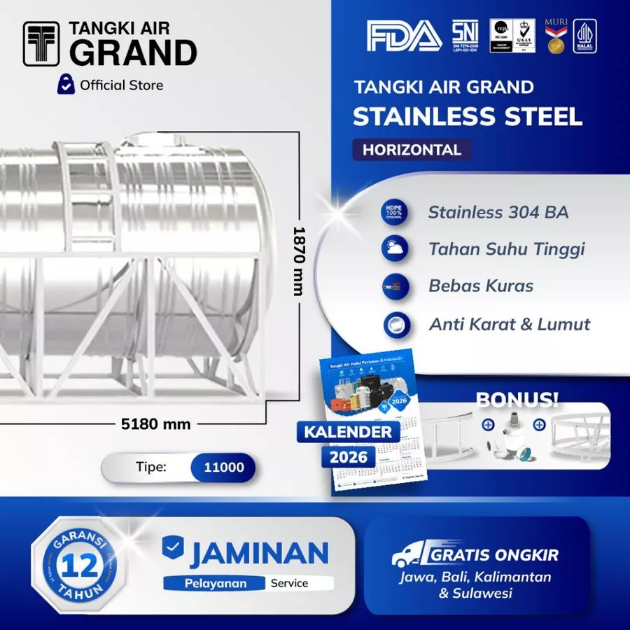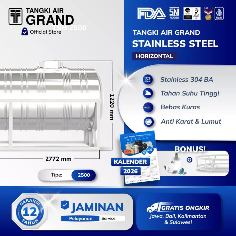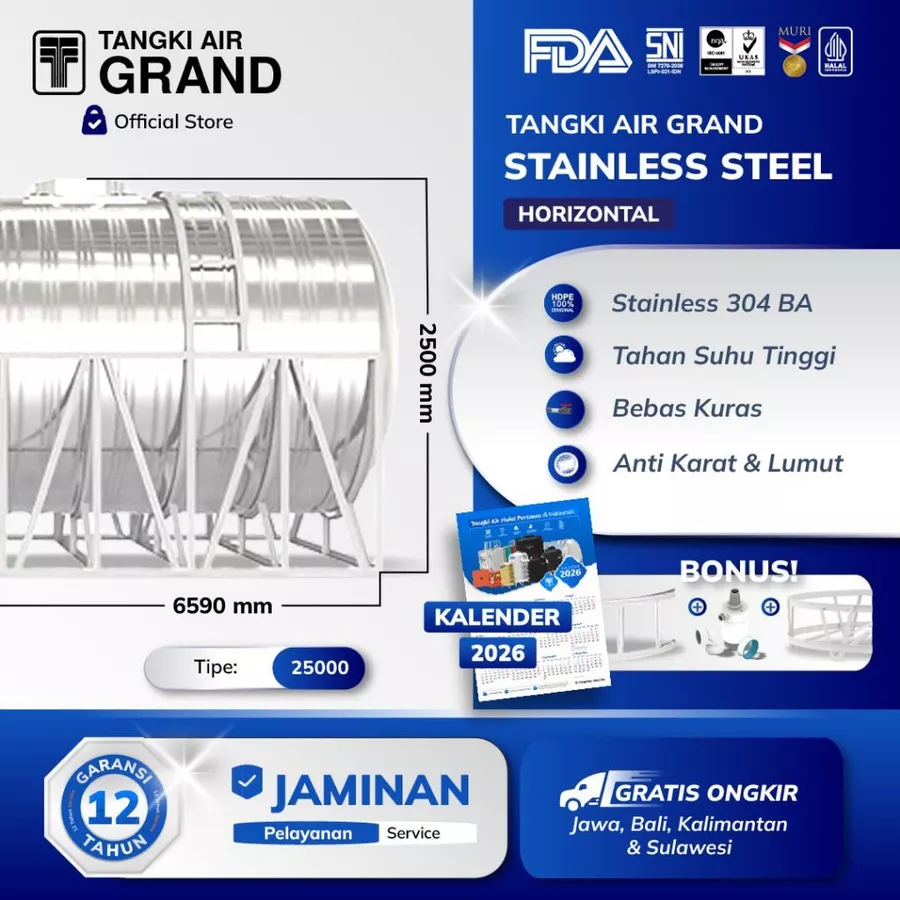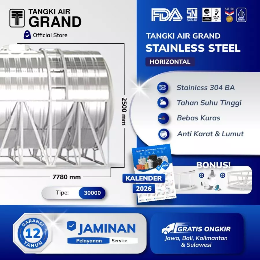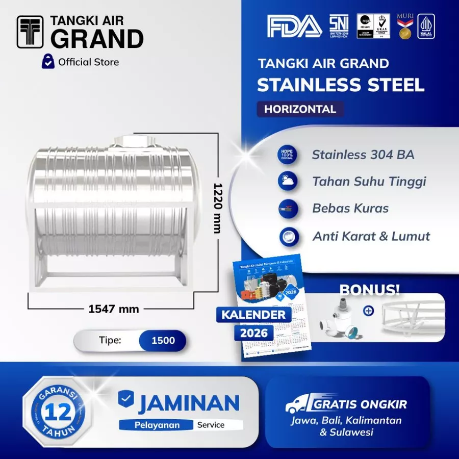Toren Grand Stainless Steel Horizontal (TSH) merupakan opsi penyimpanan air kelas dunia yang menyatukan kestabilan struktur dengan standar kebersihan yang sangat terjaga. Menggunakan material Stainless Steel 304 pilihan, produk ini diciptakan khusus untuk mempertahankan kejernihan air sekaligus memberikan perlindungan menyeluruh dari ancaman karat serta lumut.