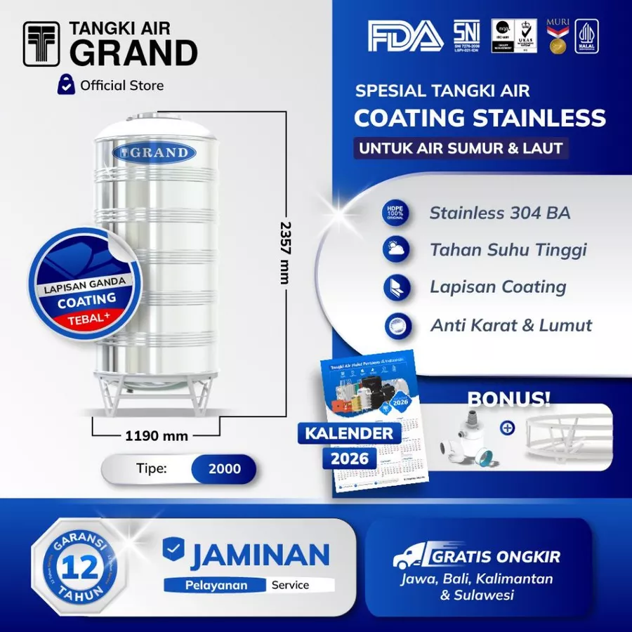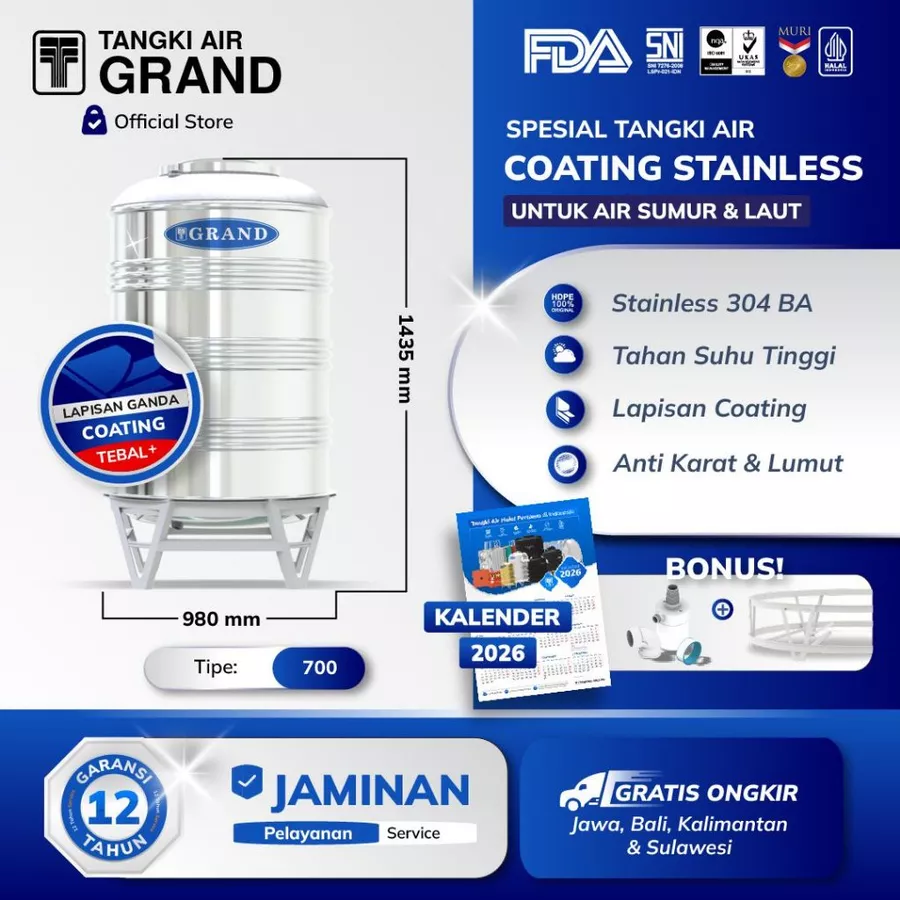 Toren Grand Stainless Steel Vertikal Coating (TSVS) hadir sebagai inovasi penyimpanan air mutakhir yang menawarkan perlindungan ganda melalui perpaduan struktur kokoh dan lapisan proteksi ekstra. Menggunakan basis material Stainless Steel 304 yang dilapisi teknologi coating khusus, unit ini diciptakan untuk menjaga sterilitas air secara maksimal sekaligus memberikan ketahanan luar biasa terhadap korosi, bahkan pada kondisi air yang lebih agresif.