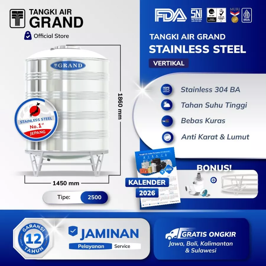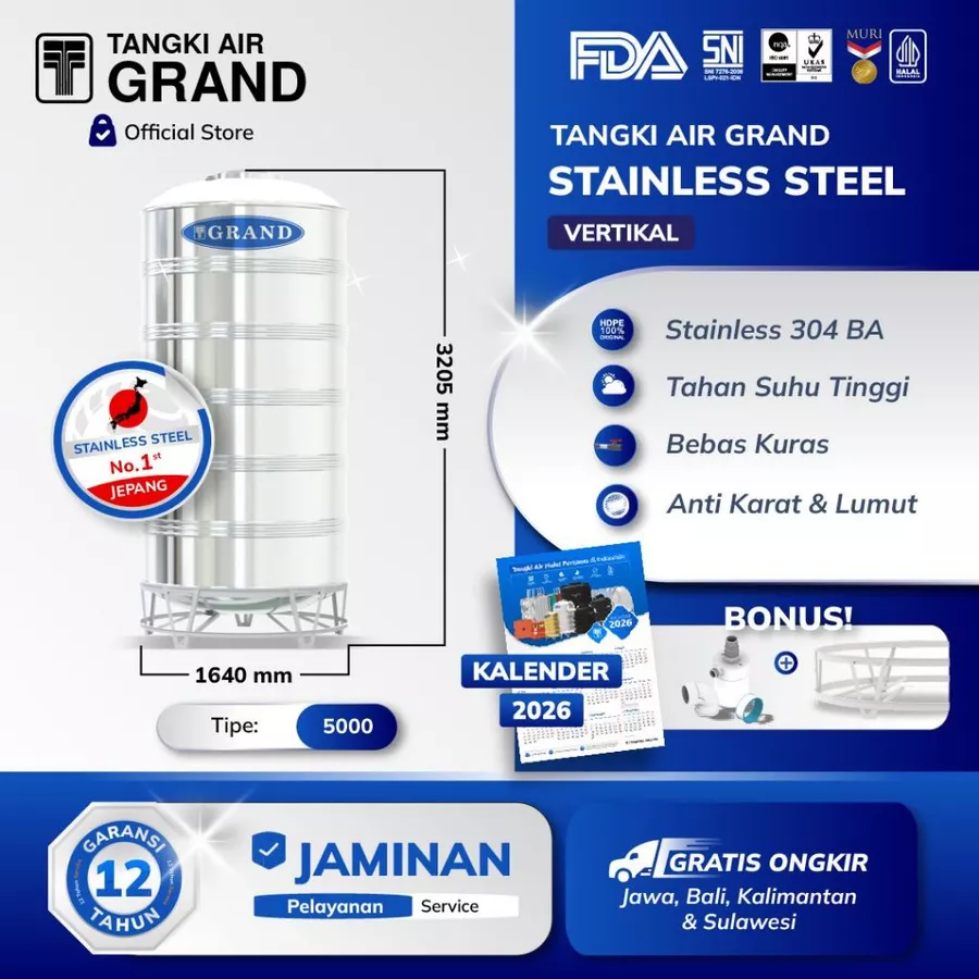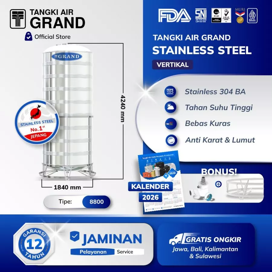 Toren Grand Stainless Steel Vertikal (TSV) hadir sebagai opsi penampungan air kelas atas yang memadukan ketahanan struktur fisik dengan standar kebersihan maksimal. Mengandalkan material Stainless Steel 304 yang sudah teruji, unit ini diproduksi secara khusus guna memastikan kualitas air tetap murni tanpa kontaminasi karat maupun pertumbuhan lumut.